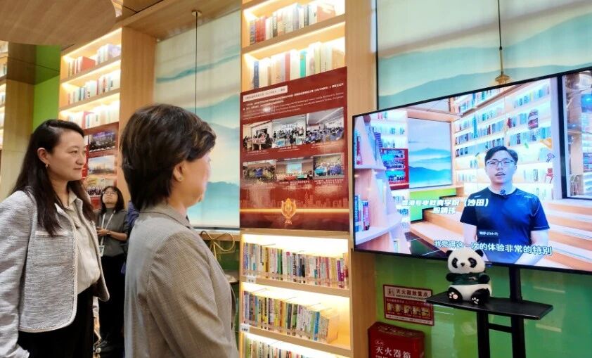 在学校与香港职业训练局合作开发的《增强与虚拟现实工程》课程展板前,蔡若莲博士听取了课程实施情况汇报,并通过课后访谈视频,进一步了解香港青年学生在川的学习收获和成长变化。